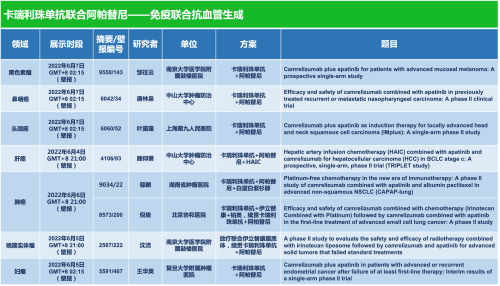卡瑞利珠单抗联合asiagame医药的另一款创新药法米替尼在甲状腺癌和结直肠癌领域有2项研究被接收为壁报,另有卡瑞利珠单抗联合化疗的4项研究在肺癌、结直肠癌、头颈癌和阴茎癌领域的研究被接收为5份壁报。